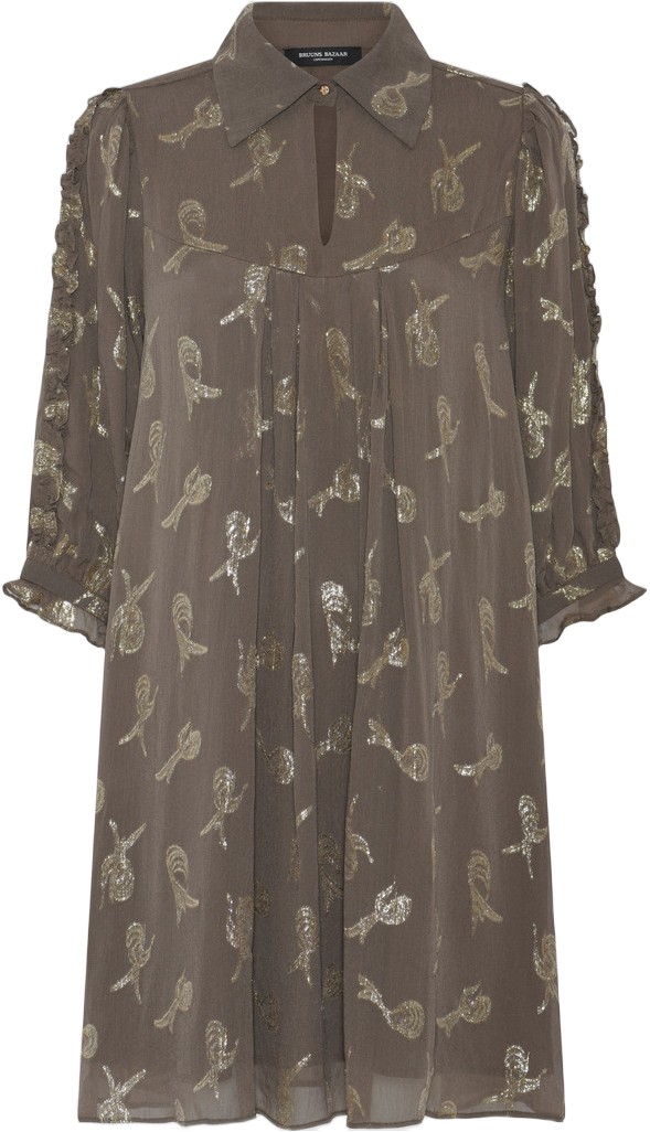 AmaranthusBBTammi-kjolen er en Løs kjole i knælængde med krave og pufærmer. Den transparente overflade og det gyldne tryk giver den et legende og elegant look. Sæt den sammen med støvler og tights til efteråret, eller style den med hæle og en håndtaske ti