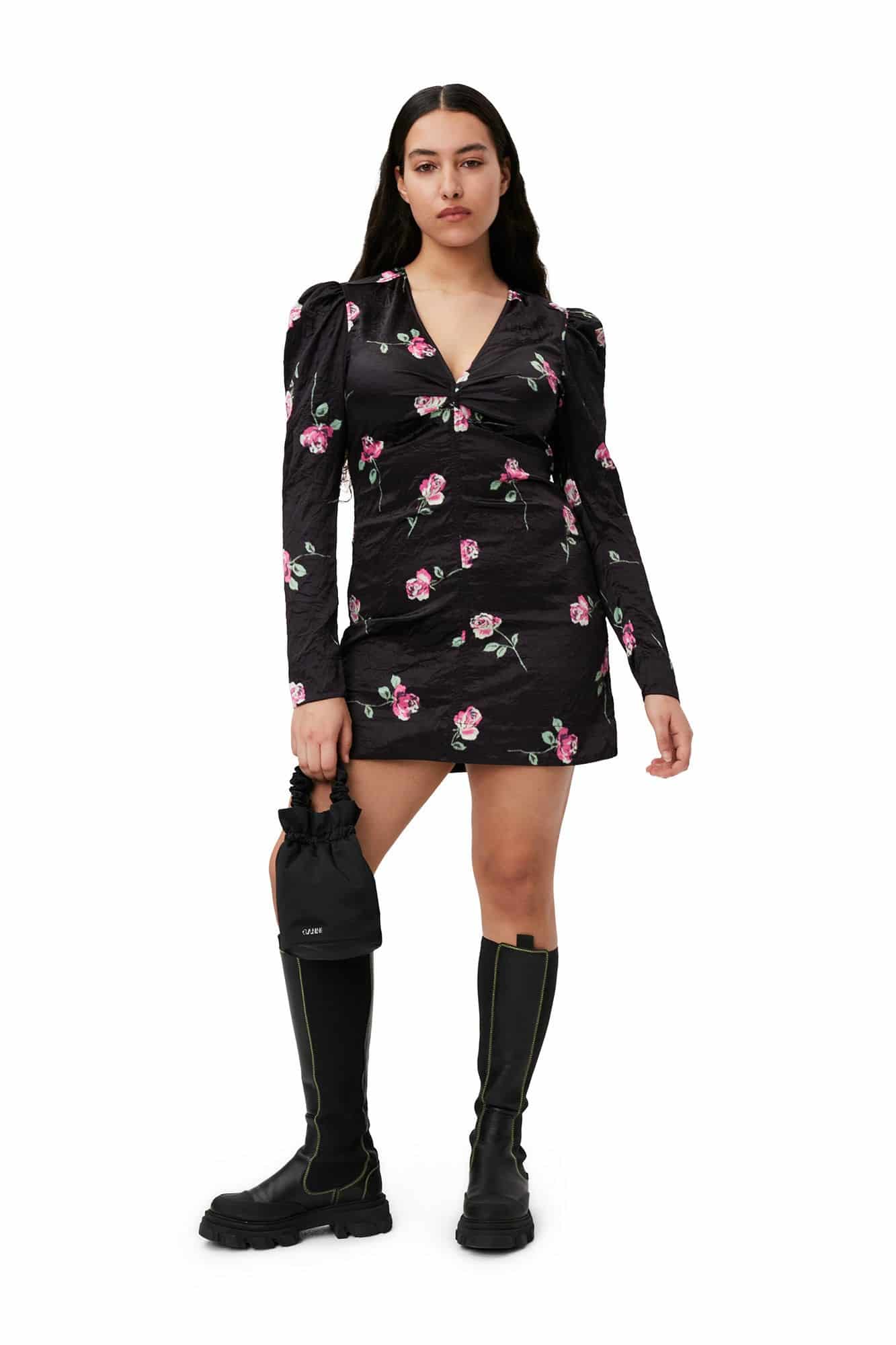 Crinkled Satin V-neck Minikjole i 95% certified recycled polyester. Kjolen er designet i et slim fit med en V-halsudskæring, lange pufærmer, lynlåslukning, blomsterprint og et krøllet satin look.
