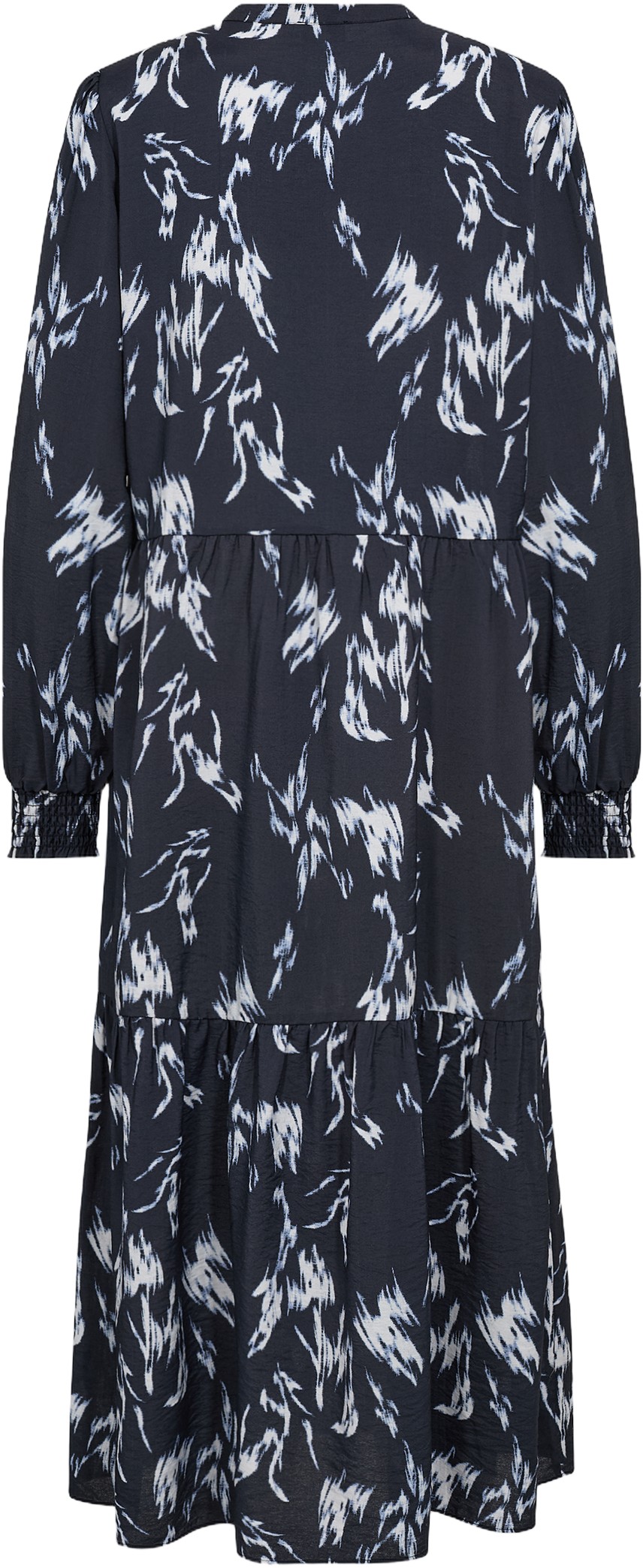 LR-PENN 2 er en elegant kjole fremstillet af 90% LENZING ECOVERO-viskose og 10% nylon. Den har en rund krave, knaplukning, lange pufærmer og et abstrakt print med et midilangt skørt. Sæt den sammen med minimalistisk tilbehør og ankelstøvler for et elegant