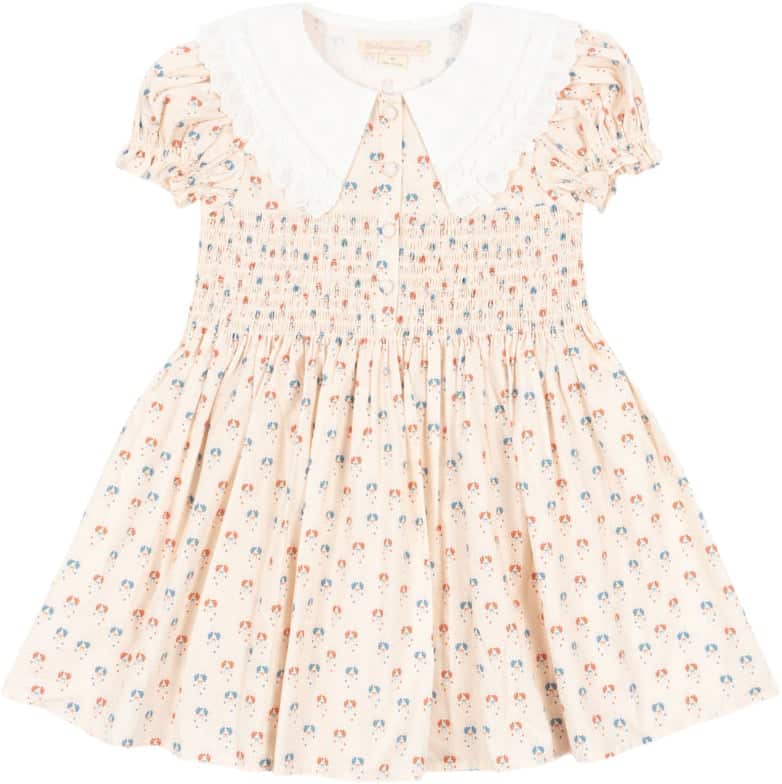 Blød bomuldskjole med pufærmer, blondekrave og smocked topdel. Fremstillet af 100 % økologisk bomuld GOTS, Organic,certificeret af CU1094701