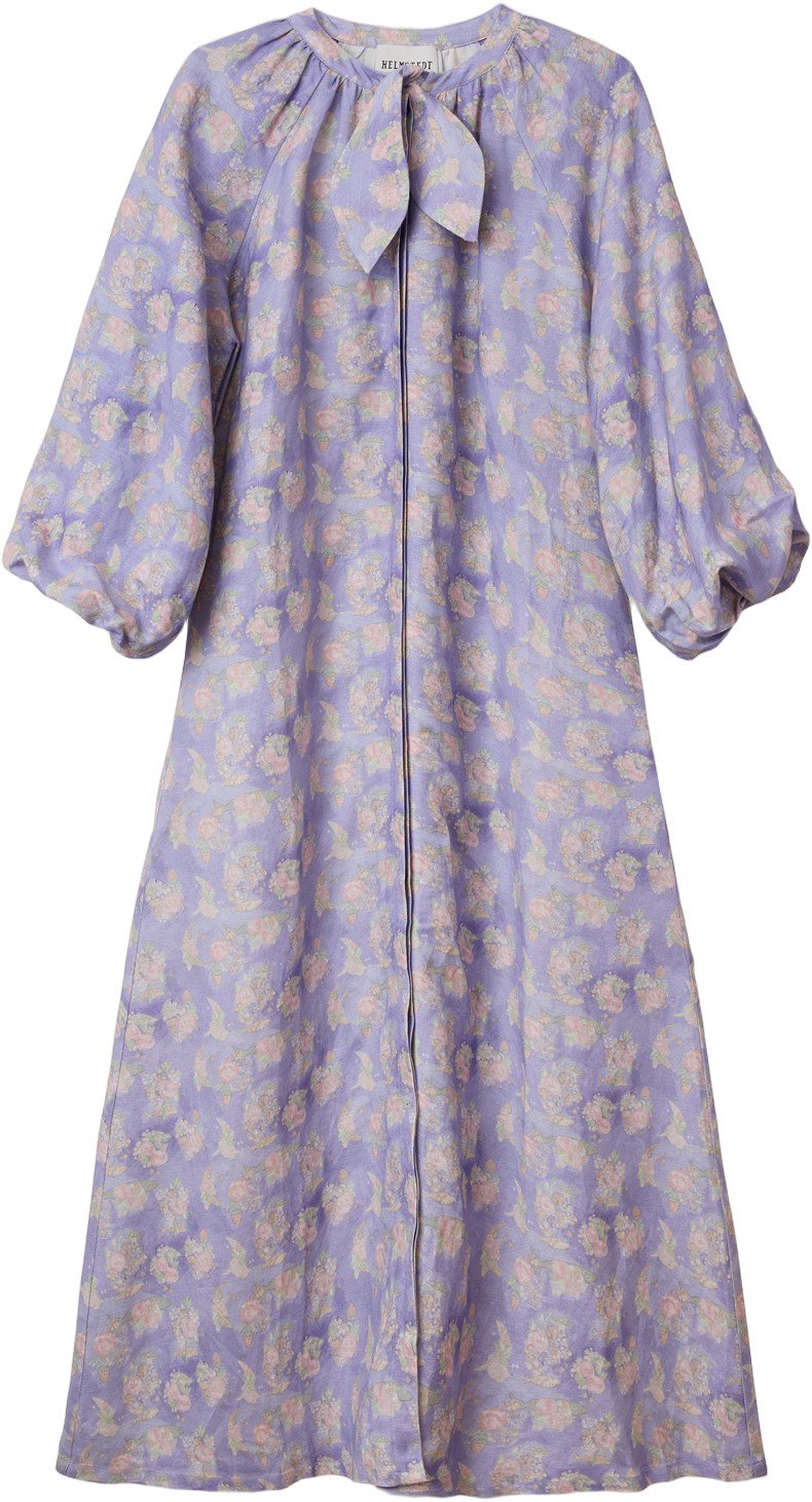 Momo Dress er en lang, overdimensioneret kjole med raglan dobbeltlagede pufærmer med heldækkende tryk med håndmalede blomster og signatur Helmstedt-motiver. Momo kjolen er designet med en slids foran i sømmen for nem bevægelse og fleksibilitet. Den har sk