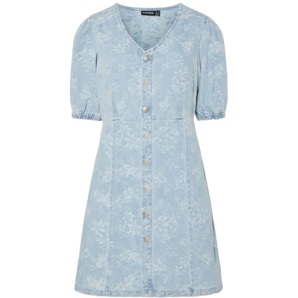 Smukkeste kjole fra Pieces, med v-hals og pufærmer. Perfekt til de solrige dage og varme sommeraftener. – Pufærmer- Knaplukning – Perfekt til sommerMateriale: 100% bomuld