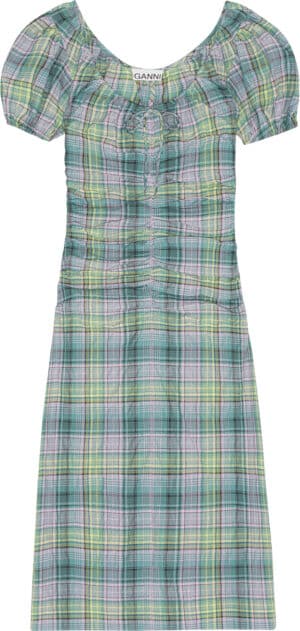 Seersucker Check Gathered U-neck Midikjole i 60% certified organic cotton. Kjolen er designet i et slim fit med en U-halsudskæring med bindebånd, lynlåslukning i siden, korte pufærmer med elastiske kanter og en tilrynket effekt foran, bagpå og i siderne.