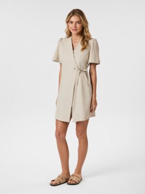 Kort kjole med slå-om-effekt. Kjolen har en v-halsudskæring, korte pufærmer og lukkes med et justerbart bindebånd i taljen. Modellen er iført størrelse 36.