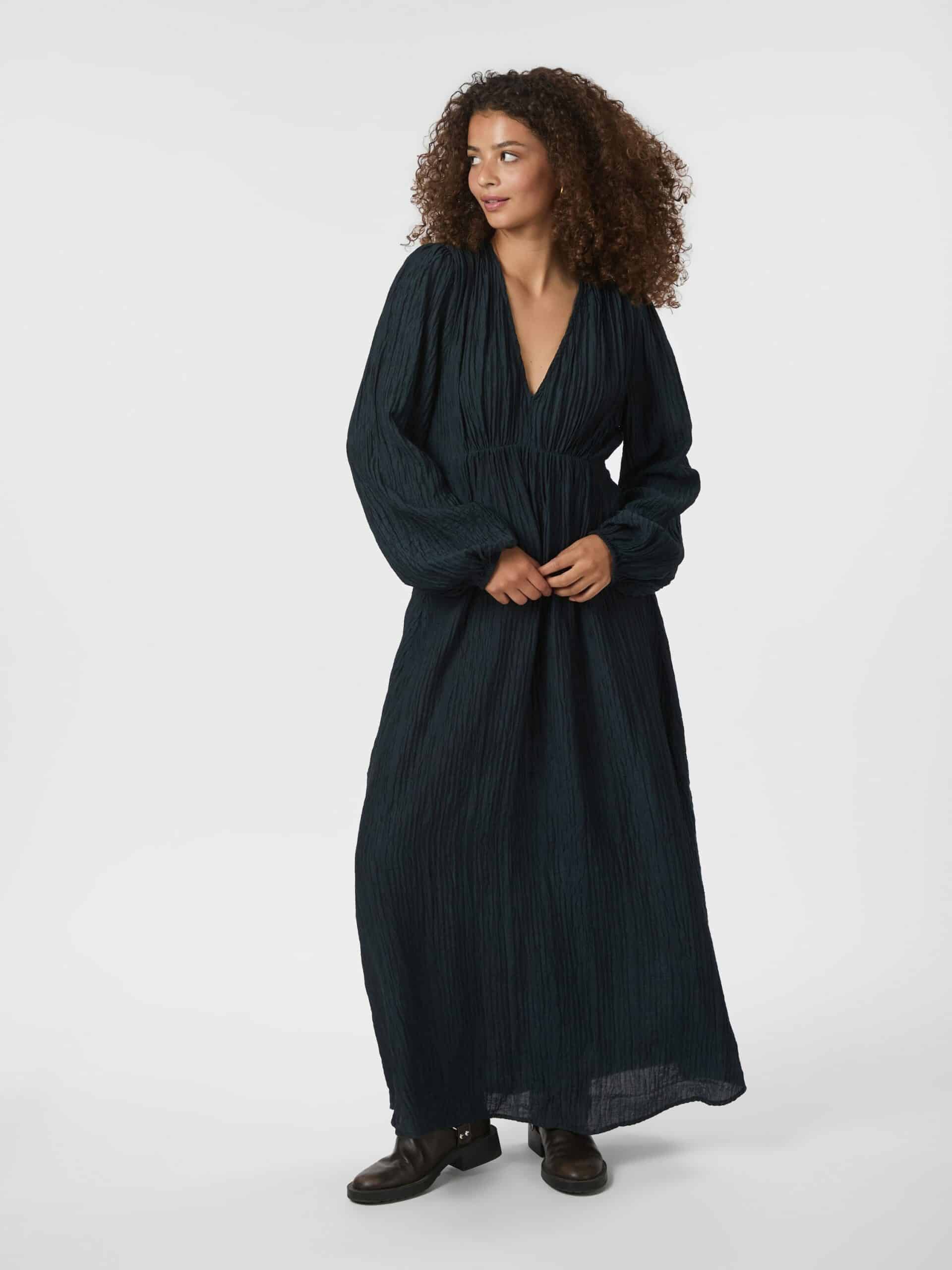 Maxi kjole i en crepe-kvalitet. Kjolen har en V-halsudskæring, lange pufærmer med elastik ved håndleddene, læg foran og skæres under brystet. Den er lavet i et let gennemsigtigt materiale med for og har en almindelig pasform. Modellen er iført størrelse 3